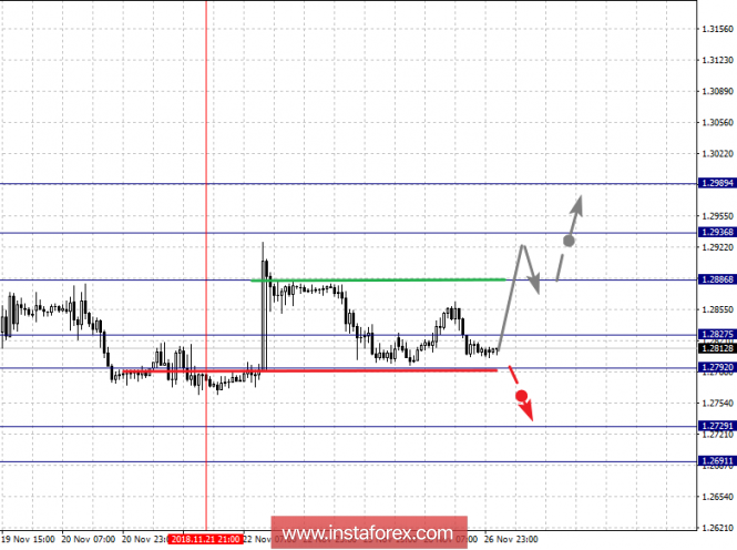 По паре Евро/Доллар ключевыми уровнями в масштабе Н1 являются: 1.1430, 1.1403, 1.1372, 1.1352, 1.1315, 1.1289, 1.1271 и 1.1244. Здесь мы продолжаем следить за нисходящей структурой от 20 ноября. Продолжения движения книзу ожидаем после пробоя 1.1315, в данном случае цель - 1.1289, в коридоре 1.1289 – 1.1271 консолидация цены. Потенциальным значением для низа считаем уровень 1.1244, от которого ожидаем откат кверху.