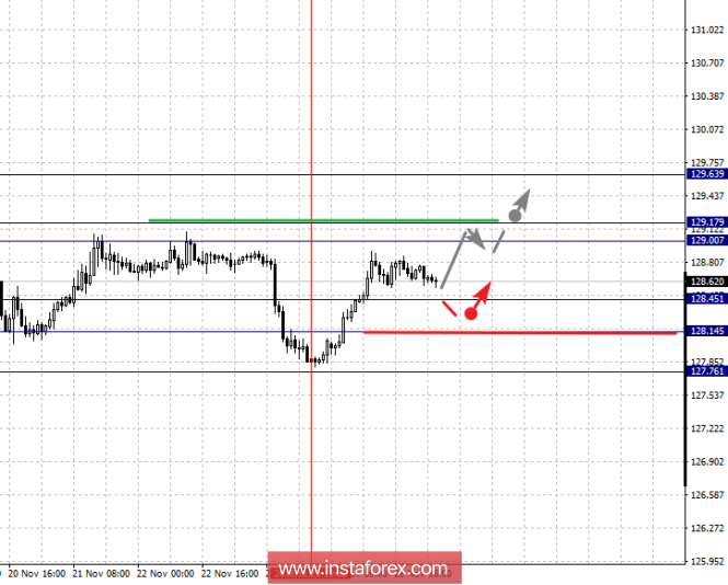 Краткосрочное нисходящее движение возможно в коридоре 128.45 – 128.14, пробой последнего значения будет располагать к формированию нисходящей структуры от 23 ноября, здесь цель – 127.76.