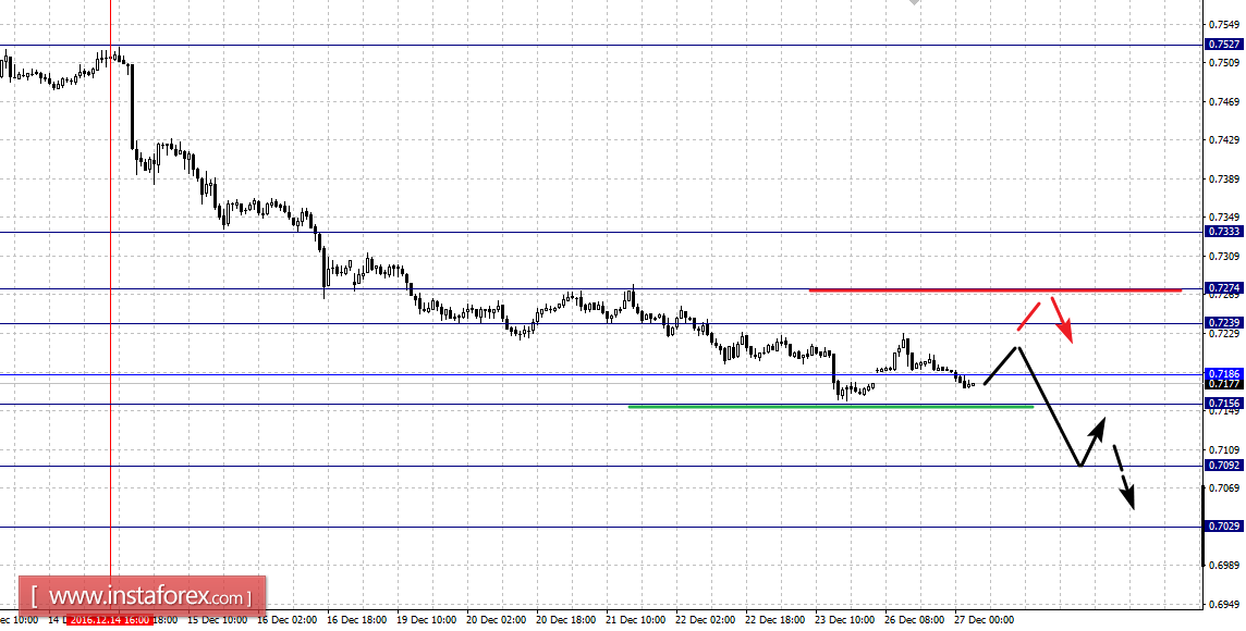 Краткосрочное восходящее движение возможно в коридоре 0.7239 – 0.7274, пробой последнего значения приведет к углубленной коррекции, здесь цель – 0.7333.