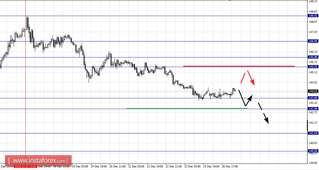 По паре Фунт/Иена ключевыми уровнями в масштабе Н1 являются: 146.94, 145.98, 145.42, 143.60, 142.98, 141.54 и 140.50. Здесь мы следим за развитием нисходящей структуры от 15 декабря. Краткосрочное движение книзу ожидаем в коридоре 143.60 – 142.98, пробой последнего значения приведет к развитию выраженного движения, в данном случае цель – 141.54. Потенциальным значением для низа считаем уровень 140.50, по достижении которого ожидаем откат в коррекцию.