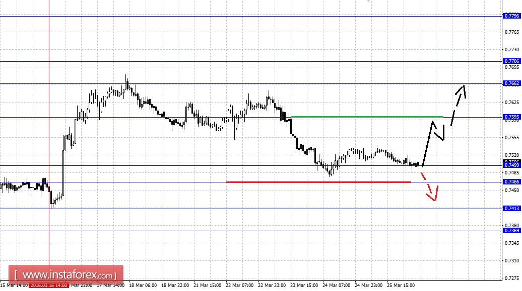Краткосрочное нисходящее движение возможно в коридоре 0.7499 – 0.7466, пробой последнего значения должен сопровождаться выраженным движением, здесь цель – 0.7413. Потенциальным значением для низа считаем уровень 0.7369, по достижении которого ожидаем консолидацию.
