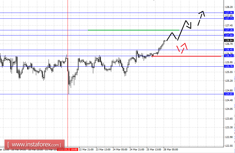 По паре Евро/Иена ключевыми уровнями в масштабе Н1 являются: 127.96, 127.73, 127.26, 127.04, 126.45, 126.21 и 125.78. Здесь мы следим за восходящей структурой от 22 марта. Продолжения движения кверху ожидаем после прохода ценой шумового диапазона 127.04 – 127.26, в данном случае цель – 127.73. Потенциальным значением для верха считаем уровень 127.96, по достижении которого ожидаем консолидацию в коридоре 127.73 – 127.96.