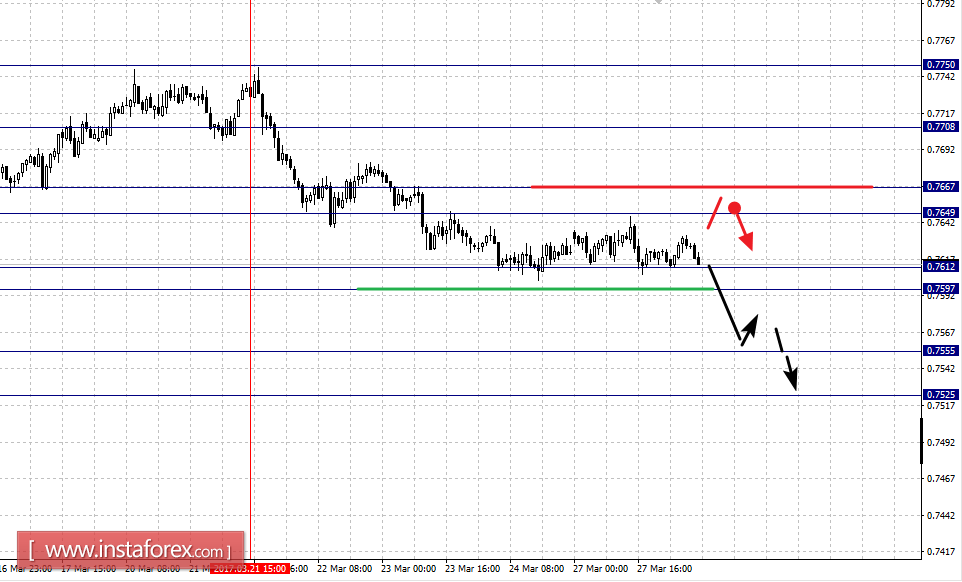 Краткосрочное восходящее движение возможно в коридоре 0.7649 – 0.7667, пробой последнего значения приведет к углубленному движению, здесь цель – 0.7708, этот уровень является ключевой поддержкой для нисходящей структуры от 21 марта.