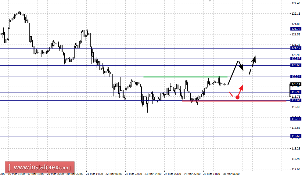 Уход в коррекционную область от нисходящей структуры возможен после пробоя 120.34, здесь первая цель – 120.68, диапазон 120.68 – 120.87 является ключевой поддержкой для низа, его проход ценой будет располагать к формированию начальных условий для восходящего цикла, в данном случае цель – 121.17.