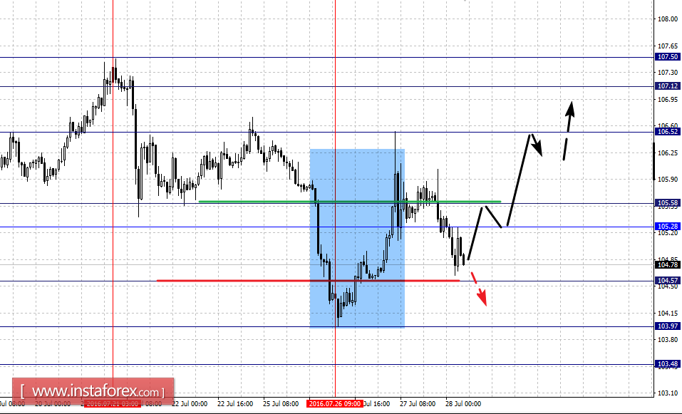 Уровень 104.57 является ключевой поддержкой для верха, его проход ценой будет располагать к развитию нисходящей структуры, здесь первая цель – 103.97. Потенциальным значением для низа считаем уровень 103.48, по достижении которого ожидаем консолидацию.
