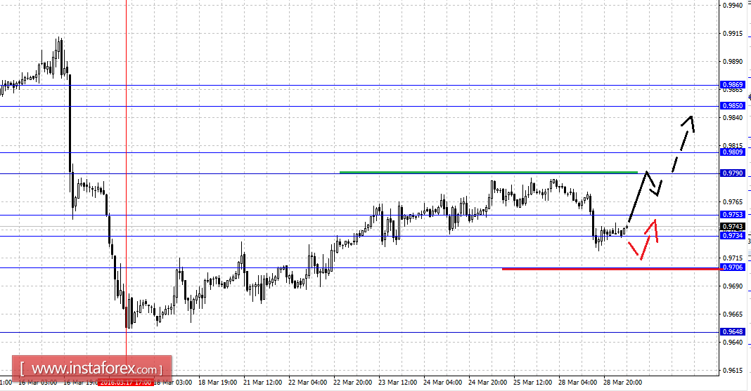 Краткосрочное нисходящее движение возможно в коридоре 0.9753 – 0.9734, пробой последнего значения приведет к углубленной коррекции, здесь цель – 0.9706, этот уровень является ключевой поддержкой для верха, его проход ценой будет располагать к развитию нисходящей структуры, в данном случае потенциальная цель – 0.9648.