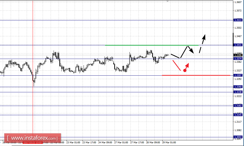 Продолжения движения книзу ожидаем после пробоя уровня 1.3307, в данном случае цель – 1.3260, проход ценой шумового диапазона 1.3260 – 1.3238 позволит рассчитывать на развитие нисходящей тенденции, в данном случае цель – 1.3182. Потенциальным значением для низа считаем уровень 1.3145, по достижении которого ожидаем откат кверху.