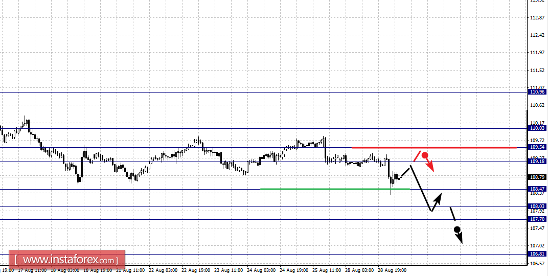 Краткосрочное восходящее движение возможно в коридоре 109.18 – 109.54, пробой последнего значения приведет к углубленной коррекции, здесь цель – 110.03, этот уровень является ключевой поддержкой для нисходящей структуры от 16 августа.