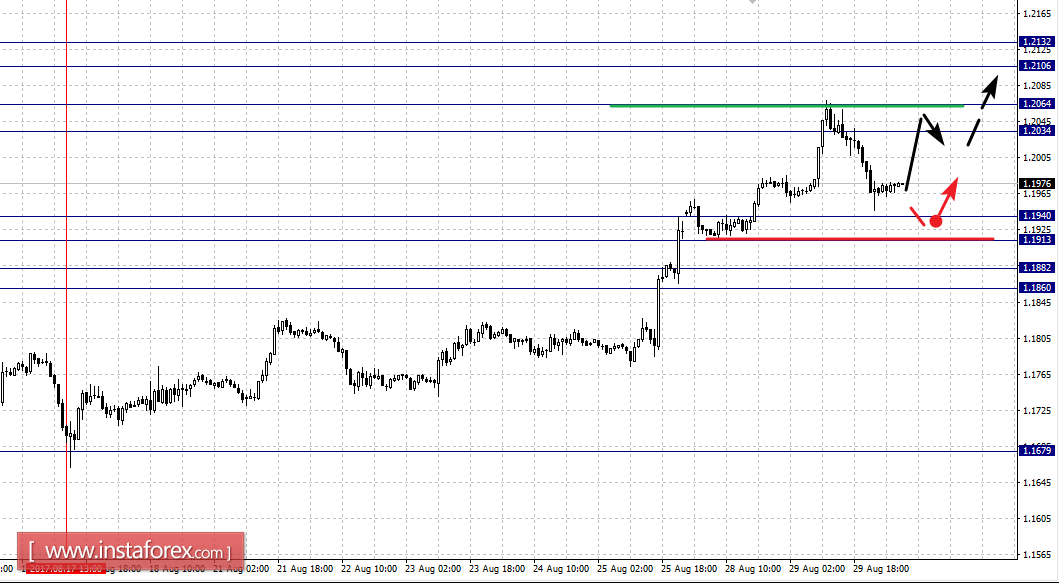 По паре Евро/Доллар ключевыми уровнями в масштабе Н1 являются: 1.2132, 1.2106, 1.2064, 1.2034, 1.1940, 1.1913, 1.1882 и 1.1860. Здесь мы продолжаем следить за восходящей структурой от 17 августа, на текущий момент цена находится в области коррекции. Краткосрочное восходящее движение возможно в диапазоне 1.2034 – 1.2064, пробой последнего значения должен сопровождаться выраженным восходящим движением, здесь цель – 1.2106. Потенциальным значением для верха считаем уровень 1.2132, по достижении которого ожидаем консолидацию, а также возможный откат книзу.