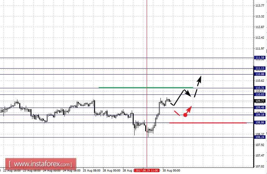 Краткосрочное нисходящее движение возможно в коридоре 109.48 – 109.18, пробой последнего значения приведет к углубленной коррекции, здесь цель – 108.88, этот уровень является ключевой поддержкой для нисходящей структуры от 16 августа.