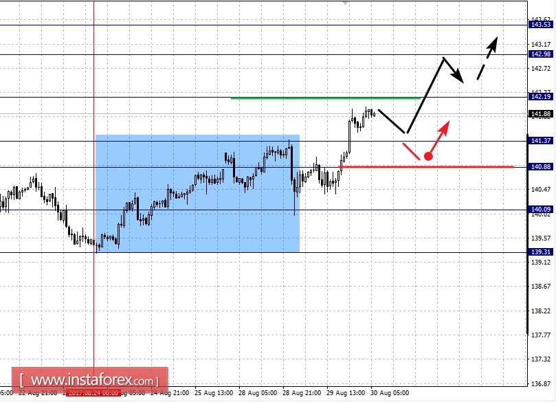 Краткосрочное нисходящее движение возможно в коридоре 141.37 – 140.88, пробой последнего значения приведет к углубленной коррекции, здесь цель – 140.10, этот уровень является ключевой поддержкой для верха, его пробой приведет к отмене восходящей структуры структуры от 24 августа, в данном случае первая цель – 139.31.