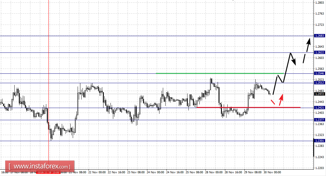 Диапазон 1.2421 – 1.2377 является ключевой поддержкой для восходящей структуры от 18 ноября, его проход ценой будет располагать к развитию нисходящей тенденции, здесь цель – 1.2301.