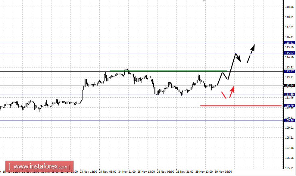 По паре Евро/Доллар развития восходящей тенденции ожидаем после пробоя 1.0670. По паре Фунт/Доллар цена находится в коррекции от начальных условий 18 ноября, продолжение движения кверху возможно после пробоя 1.2546. По паре Доллар/Франк продолжения движения кверху ожидаем после пробоя 1.0193. По паре Доллар/Иена цена находится в коррекции, продолжения движения кверху ожидаем после пробоя 113.57. По паре Евро/Иена цена формирует локальную структуру для верха от 29 ноября. По паре Фунт/Иена мы также наблюдаем формирование локальной структуры для продолжения восходящего движения от 29 ноября.