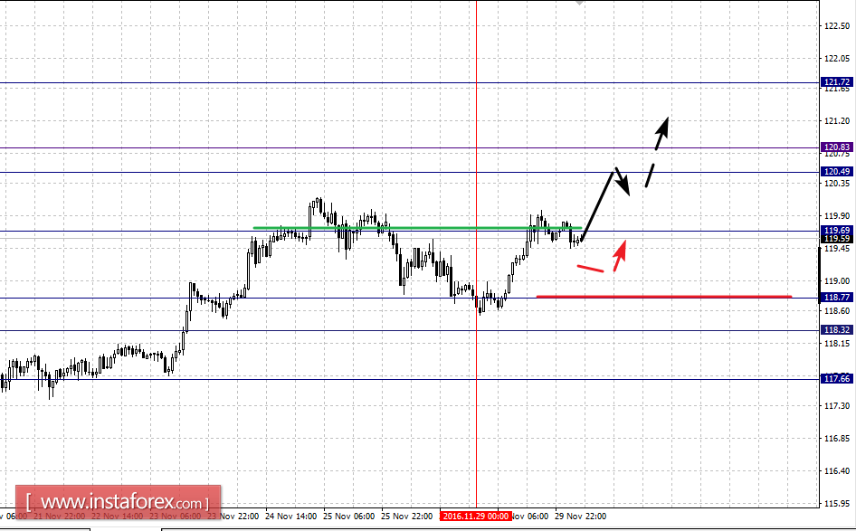 Краткосрочное нисходящее движение возможно в коридоре 118.77 – 118.32, пробой последнего значения приведет к формированию начальных условий для нисходящего цикла, в данном случае цель – 117.66.