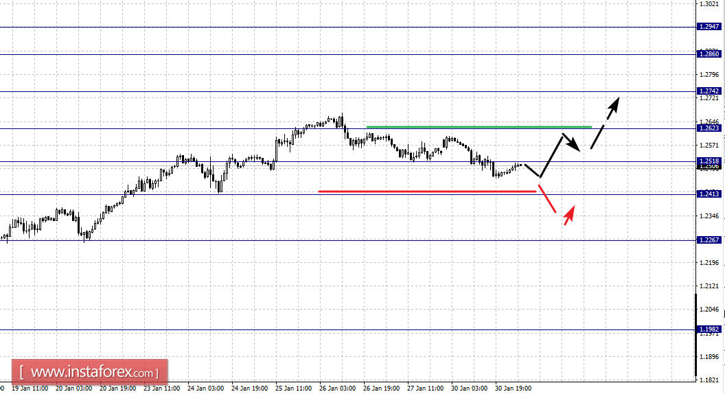 Краткосрочное нисходящее движение, а также консолидация, возможны в коридоре 1.2518 – 1.2413, пробой последнего значения будет располагать к развитию нисходящей структуры, в данном случае первая потенциальная цель – 1.2267.