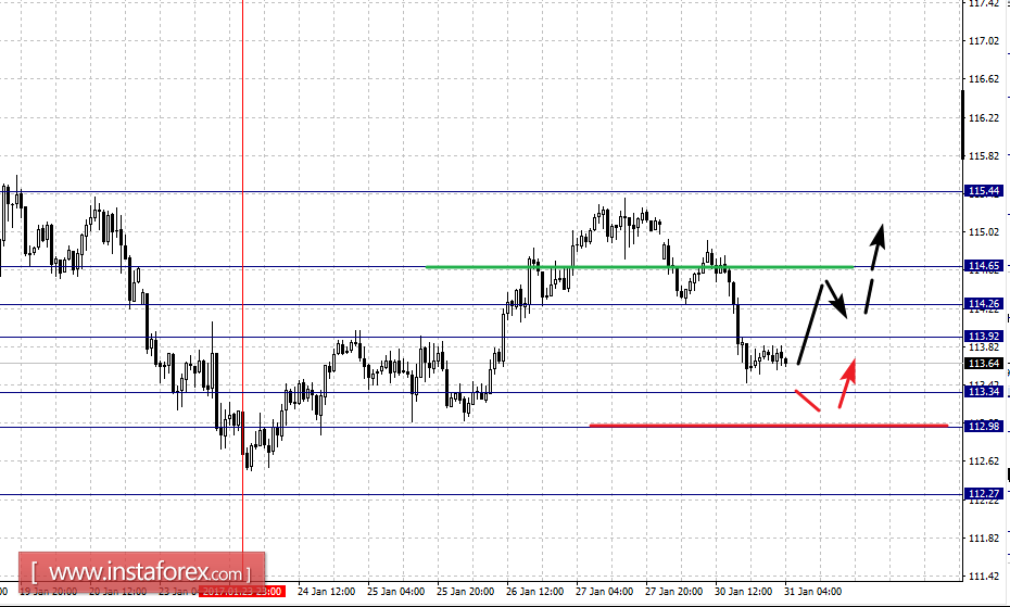 По паре Доллар/Иена ключевыми уровнями в масштабе являются: 114.65, 114.26, 113.92, 113.34, 112.98 и 112.27. Здесь диапазон 113.34 – 112.98 является ключевой поддержкой для восходящей структуры от 23 января, в нем мы ожидаем краткосрочное движение книзу, пробой уровня 112.98 приведет к развитию нисходящей тенденции, в данном случае первая цель – 112.27.