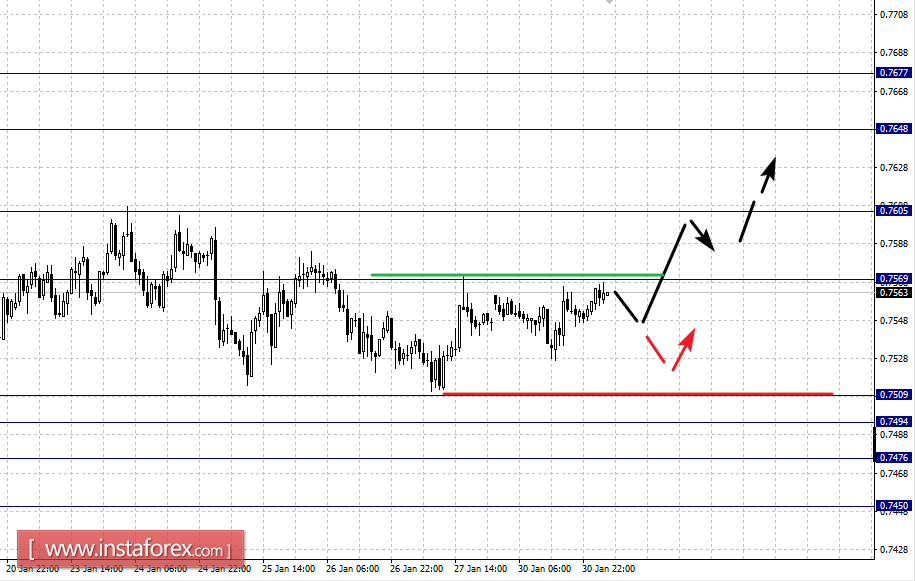 Краткосрочное нисходящее движение возможно в коридоре 0.7509 – 0.7494, пробой последнего значения приведет к углубленной коррекции, здесь цель – 0.7476, этот уровень является ключевой поддержкой для восходящей структуры, его пробой позволит рассчитывать на движение к уровню 0.7450.