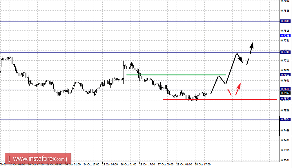 Краткосрочное нисходящее движение, а также консолидация возможны в коридоре 0.7610 – 0.7577, пробой последнего значения приведет к развитию нисходящего движения, здесь цель – 0.7505.