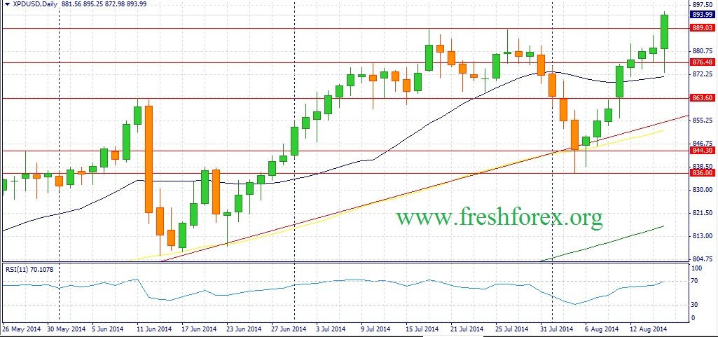 Металлы платиновой группы на грядущей неделе ожидает умеренно нисходящая тенденция на фоне укрепления позиций американской валюты, а так же снижения котировок других товарных активов. Стоит отметить, что палладий (XPD/USD) сейчас выглядит краткосрочно перекупленным и можно ожидать, что данный металл будет сильнее находиться под давлением. Однако, на сильное снижение котировок сейчас рассчитывать не приходится – в мире по-прежнему присутствие дефицит предложения вызванных продолжительными забастовками на платиновых шахтах в ЮАР и в этой связи спрос на платину (XPT/USD) может возникнуть на отметке 1440, а на палладий (XPD/USD) на уровне 870.
