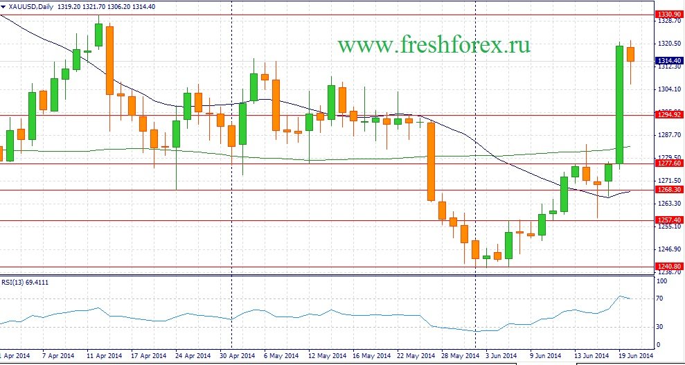 Геополитические риски вновь вернулись на рынок “желтого металла” и на этом фоне мы наблюдаем “бычье” ралли. Поскольку США не стали занимать активной позиции в решении иракской проблемы – котировки нефтяных фьючерсов марки Brent установили свежие максимумы за последние 8 месяцев и нацелены на дальнейший рост, в область 117 $/баррель. Даже если Штаты решаться на проведение военной операции, чему так противится их главный союзник в арабском мире Саудовская Аравия, в быстром темпе проблему не решить и фактор геополитической напряженности будет способствовать усилению спроса на нефть.
