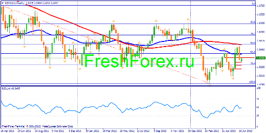 Прорыв этого уровня нацелит пару на минимум 4 июня 1.5271, а затем – на минимум 31 мая 1.5138. В случае дальнейшего падения пара нацелится на реакционный минимум 29 мая 1.5006. Сопротивление находится на максимуме пятницы 1.5529. Прорыв этого уровня нацелит пару на скользящую среднюю за 200 дней, которая сейчас находится на 1.5680, а затем – на реакционный максимум 17 июня 1.5751. Среднесрочные позитивные перспективы пары подверглись сомнению, так как на недельном графике в пятницy была сформирована свеча поглощения, указывающая на снижение, тогда как индикатор стохастик на недельном графике начал сигнализировать о снижении. В ближайшие недели пара, вероятно, будет консолидироваться со склонностью к снижению ниже сопротивления 1.5751.