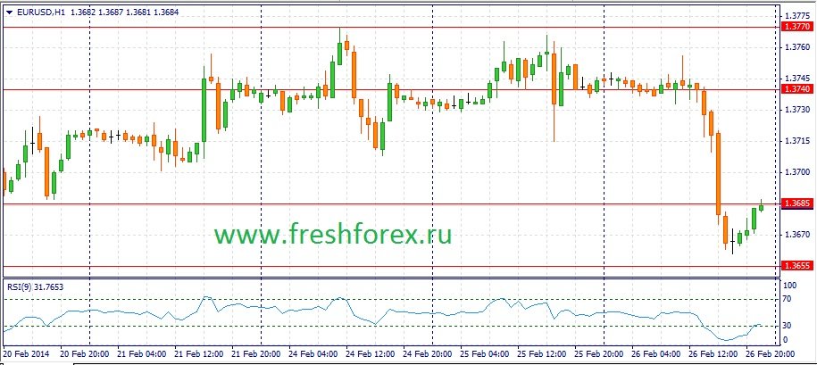 В третий торговый день недели американский доллар заметно упрочил свое положение на валютном рынке Forex. Пара EUR/USD пребывала в консолидации в первую половину дня. С приходом американских участников валютного рынка начались распродажи единой европейской валюты. Отчет по продажам жилья на первичном рынке в Штатах за январь показал уверенный прирост до отметки 468 000, что только усилило давление на пару евро/доллар. Практически все важный макроэкономические релизы за первый месяц текущего года выходили негативными и этого позитивного сюрприза “медведи” ждали давно. Потеряв по итогам дня 0.5%, торги по паре EUR/USD завершились на отметке 1.3676.