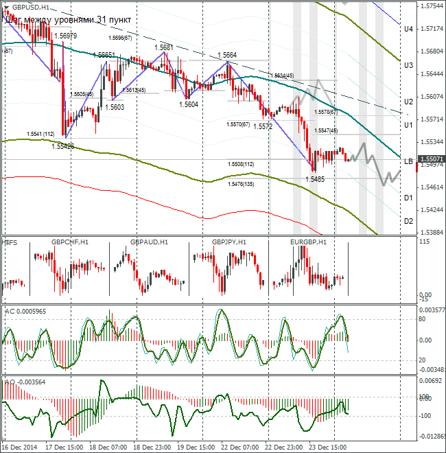 Британцу не удаётся откатиться вверх и закрыть в день в плюсе. Поскольку рынок тонкий перед праздниками и важных новостей в Британии не выходит, рассматриваю дальнейшее падение до 1,5476. Чтобы на время переломить нисходящую тенденцию на часах, необходимо для начала закрыться выше lb и потом закрепиться выше 1,56.