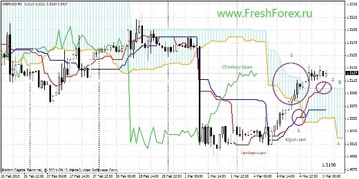 Сигналы индикатора: линия Тенкан и линия Киджун пересеклись «Золотым крестом», что говорит о росте цены (1). Цена пробила облако и движется вверх (3). Линии Тенкан и Киджун пробили облако вслед за линиями, Тенкан вышла с облака по направлению вверх (2). Облако опускается вниз, но линии облака выстроились горизонтально. Краткосрочный прогноз: в связи со сложившимися сигналами можно ожидать роста цены до 1.5190.