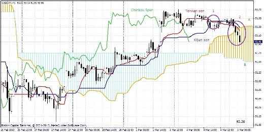 Сигналы индикатора: Линии Тенкан пересеклись с линией Киджун «Мертвым крестом», что говорит о падение цены (1). Цена, а так же линии вошли в облако и движутся вниз (2). Облако направлено на рост. Краткосрочный прогноз: Облако направлено на рост, но линии и цена вошли в облако, мертвый крест способствует падению цены, можно ожидать падения до 92.20.