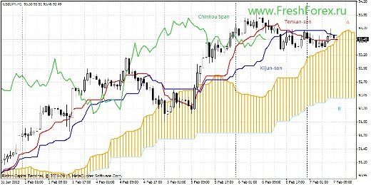 В таком случае прогноз идентичен. Сигналы индикатора: Линия Тенкан находится в переплетении с линией Киджун. Цена так же в пересечении с линиями. Облако направлено на рост цены, но линии Сенкоу спан А и В движутся горизонтально без особого направления. Краткосрочный прогноз: На данный момент точных сигналов нет, в рынок входить не желательно, на рынке флет.