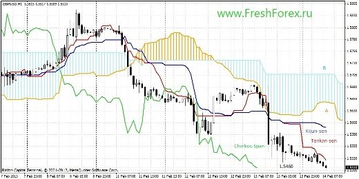 Сигналы индикатора: Линия Тенкан находится ниже линии Киджун. Цена ниже линии Тенкан и Киджун, а так же ниже облака. Облако развернуто на падение. Краткосрочный прогноз: Мы видим сочетание сигналов: Облако – Киджун – Тенкан – Цена, что говорит о падении цены. Можно ожидать падение цены до 1.5460.