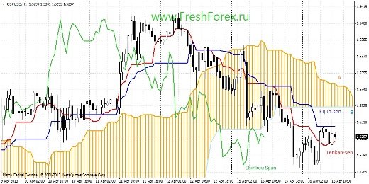 В общем если рассмотреть ситуацию, мы наблюдаем формирование нисходящего тренда. Облако немного притормозит стремительное падение, но в совокупности сигналов цена будет двигаться вниз.