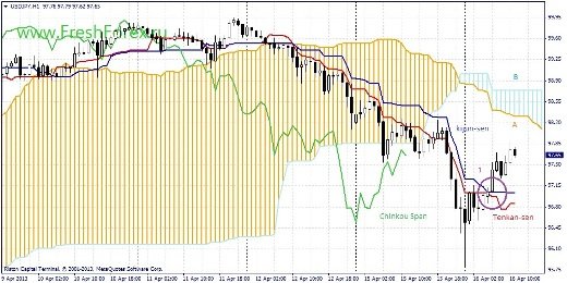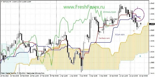 Тенкан пересекла Киджун сверху вниз «Мертвый крест», сигнал к падению цены (1). Чинкоу спан прибив цену, по-прежнему находится ниже цены. Цена пробила Тенкан и Киджун и стремится к облаку.