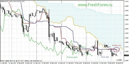 Сигналы индикатора: Линия Тенкан пересекла линию Киджун сверху вниз «Мертвый крест», что говорит о падении цены (1). Цена находится ниже линий Тенкан и Киджун, а так же ниже облака. Облако движется вниз. Краткосрочный прогноз: Облако направлено вниз, цена под облаком и линиями, выстраивалась последовательность: Облако – Киджун – Тенкан – Цена, можно говорить о падении цены до 1.3280.