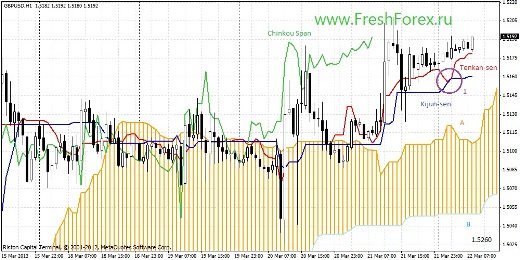 Описание сигналов индикатора: Тенкан пересеклись с Киджун «Золотым крестом» (1). Облако развернуто на рост. Цена вышла с переплетения с линиями и оказалась выше линий и облака. Краткосрочный прогноз: Образовался «золотой крест», сигнал к росту, его подкрепляет сочетание трех сигналов, Цена – Тенкан – Киджун – Облако. Мы видим мощный сигнал к росту цены, можно ожидать рост до 1.5260.