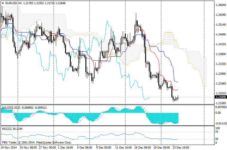 Европейская валюта продолжает сдавать позиции американцу. Вчера мы увидели новые минимумы в области 1.2160. Четырехчасовый график целиком выглядит по-медвежьи. Действительно, сохранились мертвый крест и нисходящее облако у индикатора Ишимоку, гистограмма MACD формирует очередные минимальные значения, а RSI находится в нижней части диапазона.