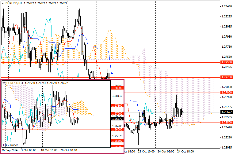 Индикатор Ишимоку. Ближайшим уровнем, до которого быки могут скорректировать падение прошедшей недели, является фигура 1.2700. Однако данное сопротивление они уже попытались протестировать. Торговля ведется внутри облака. Пробой 1.2700 даст возможность поднять курс и к верхней границе облака. Однако на четырехчасовках на уровне 1.2700 находится нижняя граница облака, которая, на наш взгляд, окажется более устойчивой к бычьему наступлению.