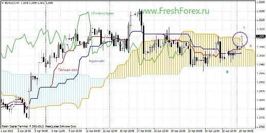 Тенкан выше Киджун, причем линии вышли с облака, пробив его снизу вверх (1). Цена пробила облако и линии (1). Облако разворачивается на рост. Мы наблюдаем сочетание сигналов: Цена – Тенкан – Киджун – Облако. Хороший сигнал на рост цены.