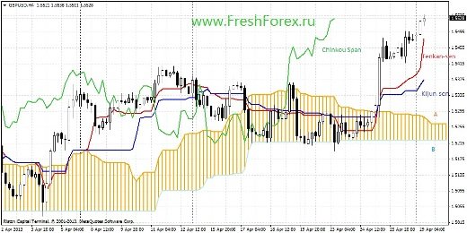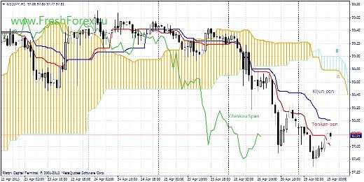 Линии Тенкан и Киджун пока еще в облаке, но готовы к выходу. Цена в свою очередь пробила линию облака Сенкоу спан А (линия поддержки). Облако направлено на рост. Можно ждать выхода линий и роста цены.