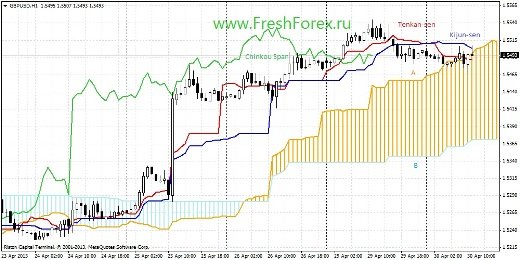 «Мертвый крест» вогнал цену в облако. Сенкоу спан А (линия поддержки) не выдержала и цена вошла в облако. Линии Тенкан и Киджун входят в облако. Цена и линии в облаке, данное положение говорит о флете. Принято считать и как показывает практика, если цена в облаке, то вход опасен. Можно попробовать войти в рынок на падение опираясь на «мертвый крест», но данное действие будет рискованным. В целом говорим о флете.