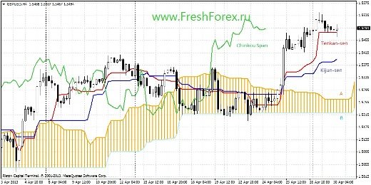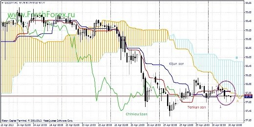 Тенкан и Киджун в переплетении. Цена опустилась ниже линий. Облако растущее. При данном сочетании сигналов можно говорить о флете на рынке. Тенкан и Киджун выше облака, а облако растущее – сигнал к росту. Но так как цена пробила линии Тенкан и Кидужн (2), которые в свою очередь выступают линиями сопротивления. Данный пробой сдержит цену. Цена может опуститься к облаку. Если цена пробьет облако, войдя в него, а линии образуют «мертвый крест» (1), то ожидаем дальнейшего падения.