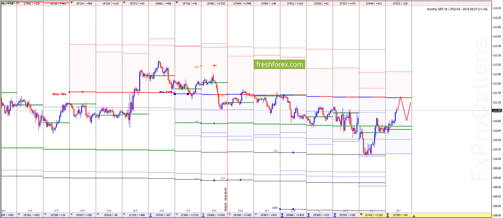 Месячные опционные контракты, торгуются в зоне убытков выше уровня баланса дня 110.69. Доминирующая позиция у покупателей. Новых контрактов нет. Премия границы рынка на уровне 110.11, является основным сопротивлением для действующего контракта. В случае его пробоя целью выступает динамическая премия рынка 111.90.