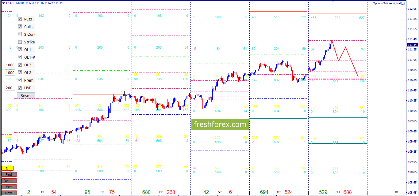 Месячные опционные контракты, торгуются у зоны убытков. Все критические уровни безкоррекционно пробиты. Доминирующая позиция у продавцов. Баланс дня на уровне 110.64. Максимальный объём на уровнях 111.39. Отсутствие ликвидации потокового долга продолжительный период времени, серьёзно влияет на пару. Отчёты СОТ подтверждают среднесрочные покупки.
