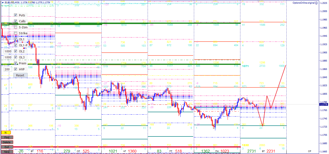 Недельные контракты торгуются в зоне убытков. Доминирующая позиция у продавцов. Образовано два новый аномальных контракта. Баланс дня на уровне 1.1772. Максимально проторгованный объём находится на уровне 1.1982. Рост актива на протяжении дня, главный сценарий.