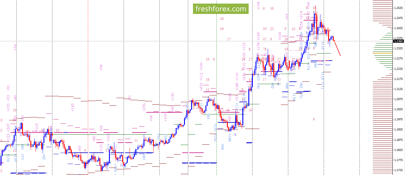 Недельные контракты торгуются в зоне комфорта. Ликвидация потокового долга не осуществлена. Объёмы доминирующих контрактов продавцов, растут. Синергия границ рынка расположена на уровне 1.2263, куда и стремиться цена. Максимальная прибыль текущей недели 1.2300.