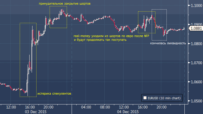 Мы всегда подчеркивали, что спекулянты являются важной составляющей финансовых рынков, но при этом большее внимание уделяли действиям real-money accounts, поскольку именно они создают тренды. В четверг активность real-money было трудно выделить из общей массы. Но на следующий день Министерство труда США публиковало отчет по занятости за ноябрь, который, оказался однозначно сильным. Свободные спекулятивные деньги тут же бросились восстанавливать короткие позиции в евро. Вот тут-то и стали заметны real-money. Получив встречную ликвидность от спекулянтов, вновь возжелавших купить доллар в счет заемного евро, длинные деньги стали покидать свои короткие позиции по евро.