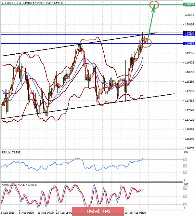 Пара EURUSD достигла верхней границы фигуры продолжения тренда «восходящий флаг». Ожидаем возобновления роста пары либо после ее закрепления выше отметки 1.1985,0 либо после коррекции вниз к 1.1955 с последующим ростом к 1.2085.