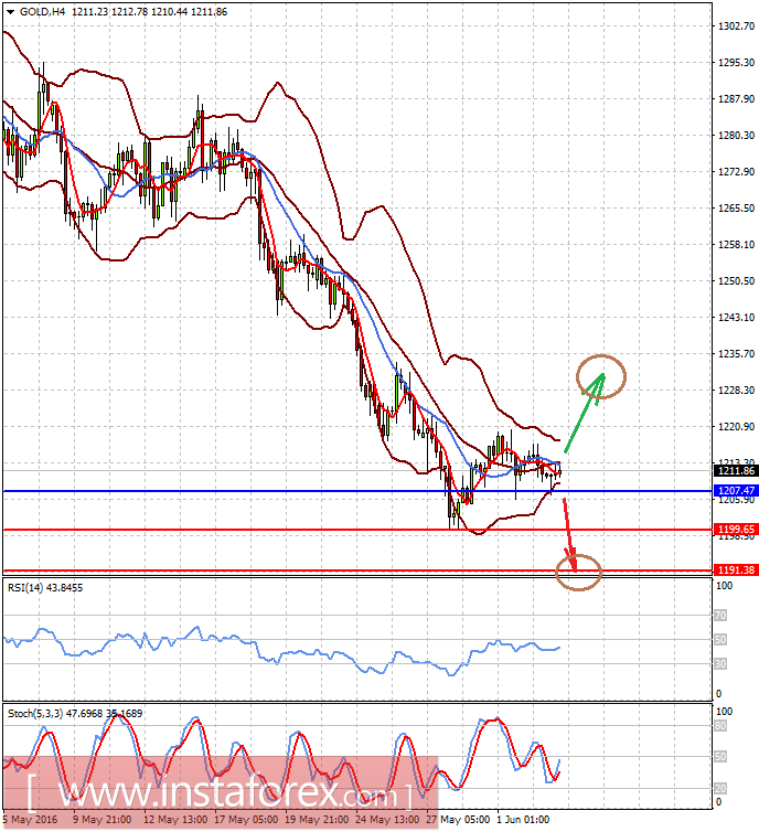 Золото на споте консолидируется в узком диапазоне и также примет участие в пиршестве на фоне выхода данных из Штатов. Оно может продолжить движение вниз, если данные окажутся сильными, к 1199.65 и 1191.40. Слабые цифры, наоборот, подтолкнут его вверх, к 1230.00.