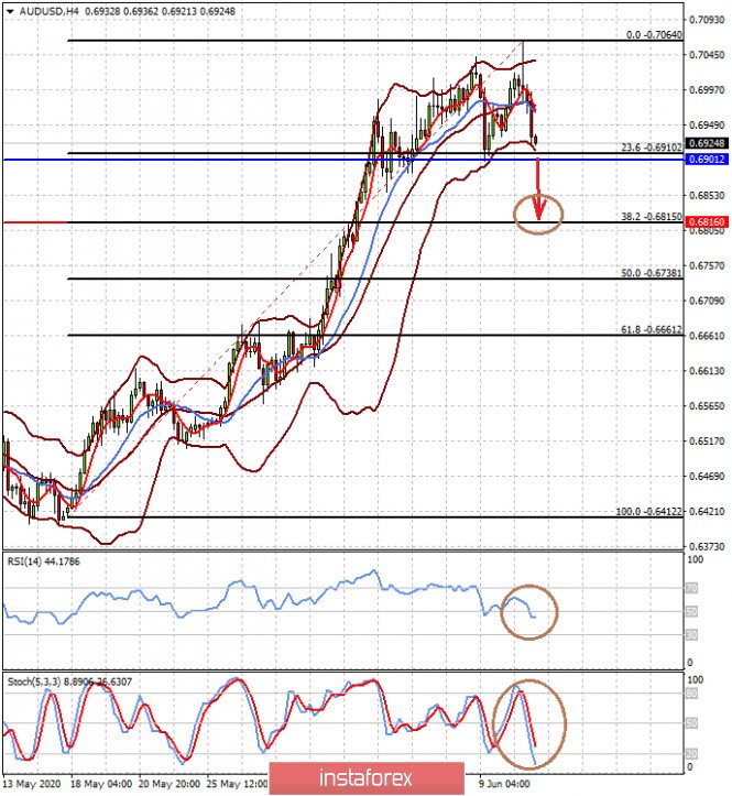 Пара AUDUSD после достижения локального максимума скорректировалась на 23% по Фибоначчи. Негативом для нее является падение цен на товарные и сырьевые активы на волне коррекции на рынках, а также политические трения с Китаем, который для страны является важным экономическим партнером. Снижение цены ниже отметки 0.6900 приведет к коррекционному падению 38% по Фибоначчи, к 0.6815.