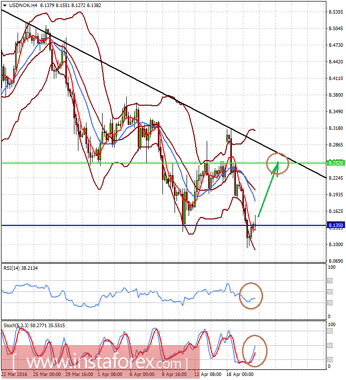 Пара USD/NOK на волне снижения цен на сырую нефть, которое может продлиться, если данные по запасам нефти в Штатах покажут их рост, вероятнее всего, получит локальную поддержку и поднимется до 8.2520, верхней границы краткосрочного нисходящего тренда.